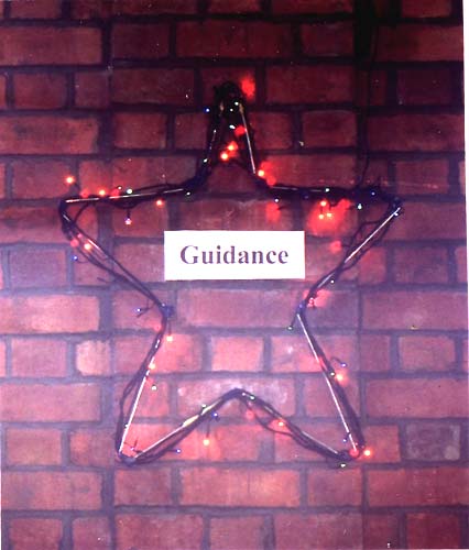 SYMBOLS The symbols were constructed as frames of no. 8 fencing wire, with sets of Christmas tree lights bound to the wire. They were suspended high enough on the walls to be easily visible, between the windows. Each set of lights was individually controlled from a switch in the balcony, as were the lights on the Christmas tree. ( Ideally all the lights used should have been operated from a single position, but for various reasons this proved to be difficult for the main spotlights and the Christmas tree spotlight. )