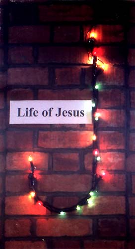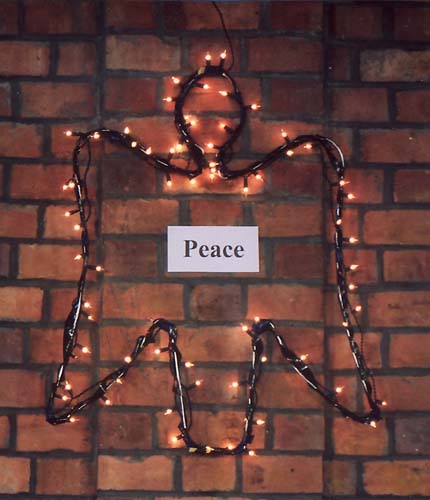 • Christmas tree with lights as decoration and a star on top. ( The star is not just decoration; it's mentioned in the service. If you don't have a star on a tree, you'll have to twiddle the words a bit. ) As this left the tree looking rather bare, we also added some "angel Hair" - long thin reflective "golden" strips - and a few small red bells; these were decorations used in a previous year and had no particular significance for this year.