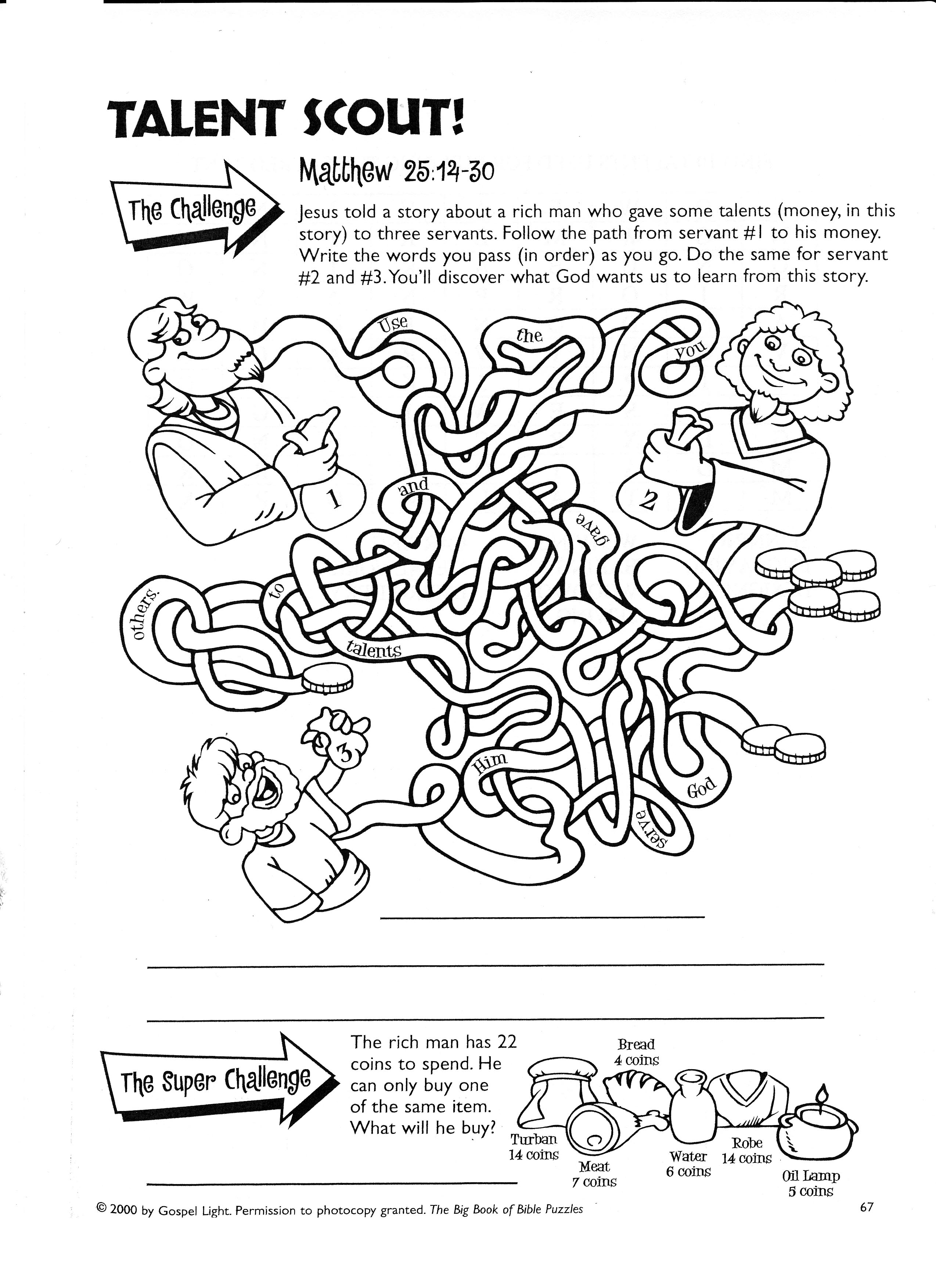| MONEY | Given out to the servants, and returned to the Rich Man. It should look good : we used "Gold" coins ( ours were made of chocolate with "gold" wrappers, and appropriately disposed of after the service ). Some "coins" ( 1, 2, and 5 ) are in the bags given to the servants, and there is extra money ready to add to two of the bags. |