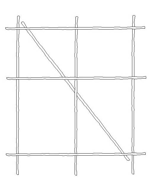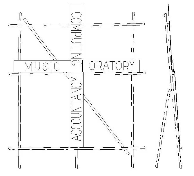 The stand is also intended to make S look a bit odd, and give some scope for amusing business. It should also give no clue to how it would be used; we could have made something less elaborate, but possibilities we considered would have given away the intention of building a cross. Our stand was a bamboo frame mounted on a child's ancient four-wheeled trolley, which was cumbersome and a bit squeaky. The stand was of bamboo poles, lightly tied together with thin wire through holes bored at the crossing points, with a diagonal for rigidity. It was supported on the trolley by two bamboo legs ( shown in the second picture following ), also anchored with thin wire. When mounted, the placards looked like this ( click the picture for a separate version ) : The heavy lines in the side view show how the placards were supported on the frame; a few judiciously placed pins in the bamboo ensured that they were in the correct position, and didn't slip off. The pins were also handy when attaching the clipboard list. NOTE : It worked, but could probably be improved. For example, it might be better to turn over the placards when making the cross; it would at least reduce the impression that the four talents used were sufficient to build the Christian church. Alternatively, something to that effect could be added to the script. |