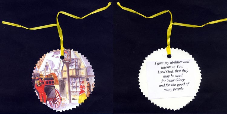 Each of the programmes given to those in the congregation included a small card, to be hung on the small tree during the service as an indication of the people's desire to offer their talents to God. The cards were cut from old Christmas cards - circles