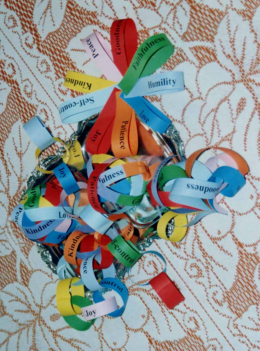 PRESENTSStrips of paper with the fruit listed on them and woven together to make interesting shapes.