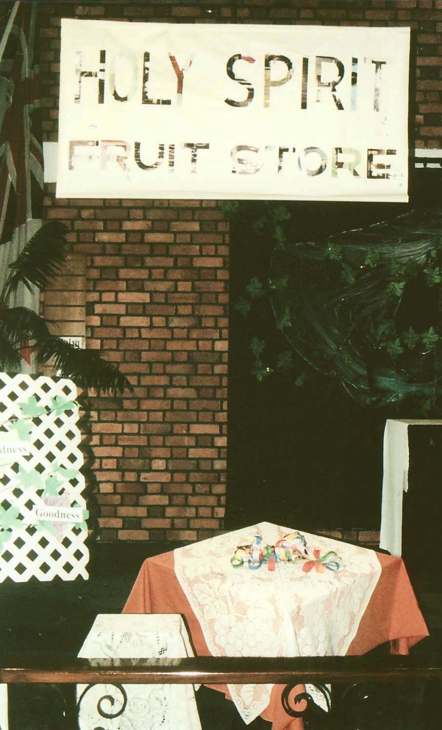 FRUIT STORE This is the focus of the Fruit Store sketch in the service. It should look plausibly like a market stall. Above it there is a banner with the text "HOLY SPIRIT FRUIT STORE", which should be clearly visible throughout the hall.