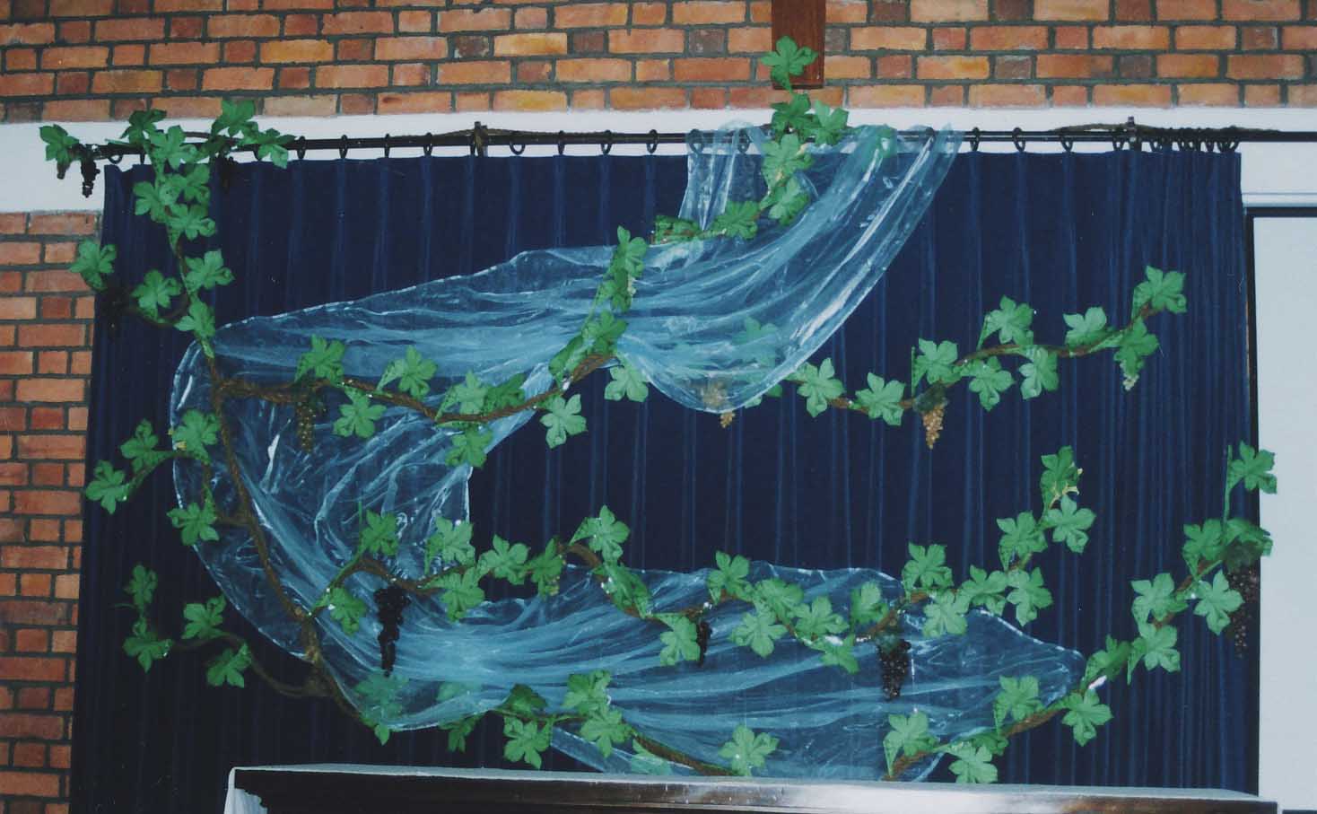 GRAPEVINE  A "grape vine" with filmy blue material woven through it to represent the Holy Spirit. On this vine there will be fruit, blossom, immature fruit and mature fruit, also dead branches etc. ( The stem of our vine was a twisted rope; grapes were plastic; leaves and blossom were paper. ) It must be prominent, and clearly visible.