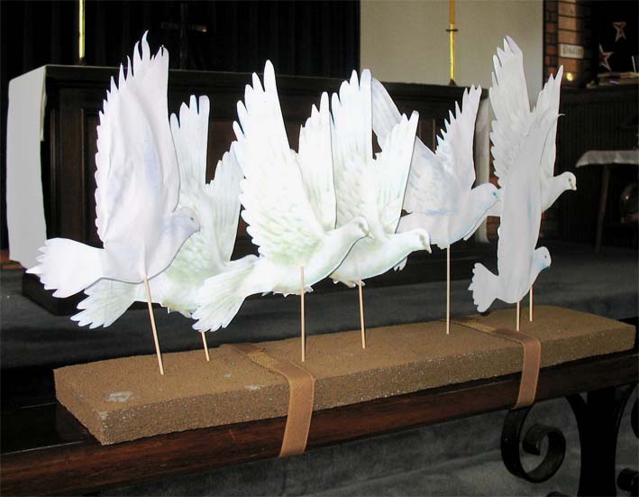 | DOVE PICTURES | Pictures of doves mounted on sticks. The picture shows them presented ready for collection; the ends of the sticks are stuck into a polystyrene foam block.