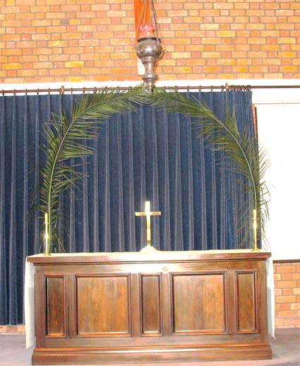 | PALM BRANCHES | These are standard features of our Palm Sunday decoration in the church. They are good-sized ( 3-4 m ) fronds from a Phoenix palm formed into two arches, one behind the altar and one at the back of the church. The picture illustrates the idea; we usually have significantly more vigorous branches, but these were the best we could manage this year.