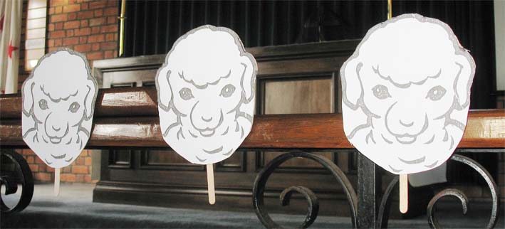 | SHEEP FACES | Pictures of sheep's faces, about the size of a human face, each mounted on card and glued to a short handle. The "sheep people" collect these and proceed to the back of the church holding them in front of their faces and saying "Baa". It's amusing and effective.