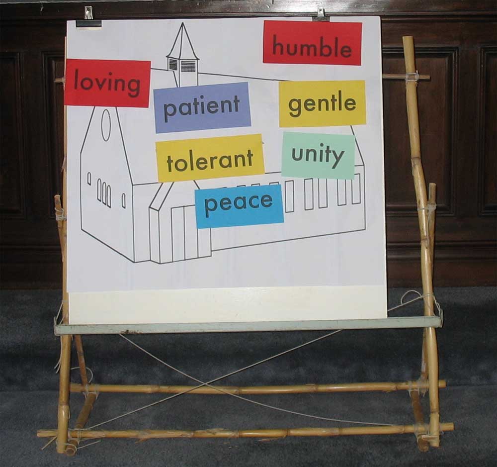 CARDS A set of cards each bearing one of the words "humble", "gentle", "patient", "loving", "tolerant", "unity", "peace", in characters ideally sufficiently large to be readable from anywhere in the church. They are prepared ready to fix onto the church picture; we used dabs of "Bluetak".