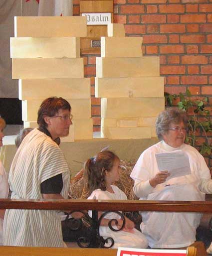 These are polystyrene foam blocks. Some are coloured a light fawn shade ( we painted them so that they looked rather less like polystyrene foam blocks ), and some ( which we acquired later ) are white. They are quite large - up to perhaps 80 × 10 × 20cm - so you can build a respectably large structure rather quickly.
