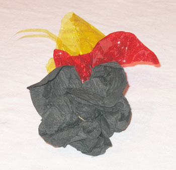 They are simply made from black paper ( the coal lumps ) and red and yellow cellophane paper ( the flames ), crumpled together as in the picture :