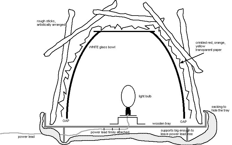 The bowl was surrounded by pieces of "fire-coloured" cellophane paper, somewhat crumpled. Unsmoothed sticks were arranged round the bowl, lightly tied in place so that they didn't fall over when the "fire" was moved.