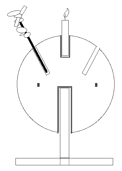 - Line each of the holes with some fairly tough coating. Polystyrene foam is fairly fragile, and people trying to attach bits and pieces during the performance can easily be flustered. It should therefore be very easy to make the attachment, in such a way that the polystyrene isn't damaged. To hold the "arms", we used plastic drinking straws which would comfortably fit the sticks used for the arms. We used an aluminium tube for the support hole, and a short steel tube for the candle ( more because we happened to have them available than for any deeper reason ).