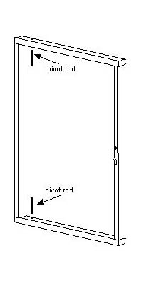We did not use ordinary hinges, as we found it fairly difficult to mount the door satisfactorily. ( We tried. ) Instead we used the pivot arrangement shown in the diagrams. The pivot rods pass through the top and bottom door members, and into the pivot blocks attached to the frame. This gives a very freely swinging door; it has a fair bit of space at top and bottom, and - obviously - doesn't hinge at the door frame, but it wasn't noticeable. We found it useful to provide the support block so that the door could stand vertically when "closed" without distorting the frame. ( We were happily surprised to find that there was very little distortion when the door was "open", provided that the frame was firmly supported vertically, for which we used string guys. )