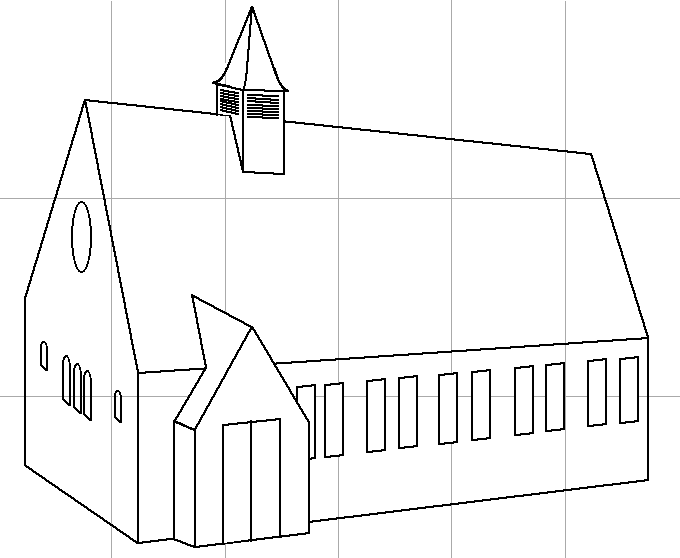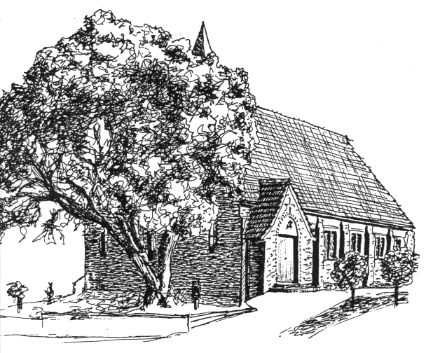 For our Family Service in July 2005 we wanted a sketch of the church. This is it. ( The pale lines marked printing boundaries; each rectangle was printed at A4 size, and the whole stuck together to produce a good-sized picture. )