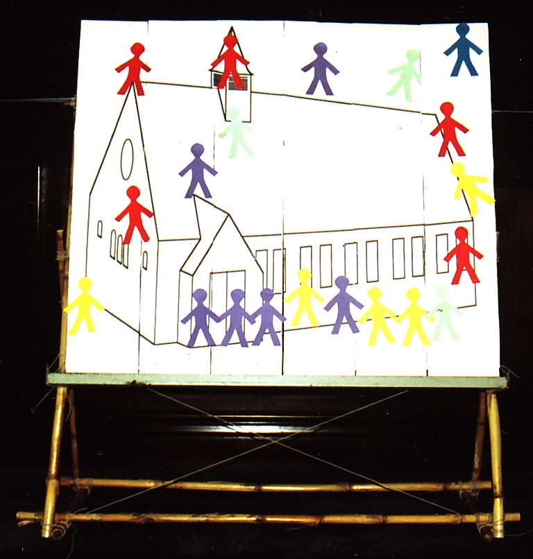 This sketch was drawn as part of the advertising of one of our very early family services, and continued to be a sort of Family Service badge for many years. The earliest version had "PUPPETS" instead of "PRAYERS", and didn't have an apostrophe in "AUGUSTINE'S". |